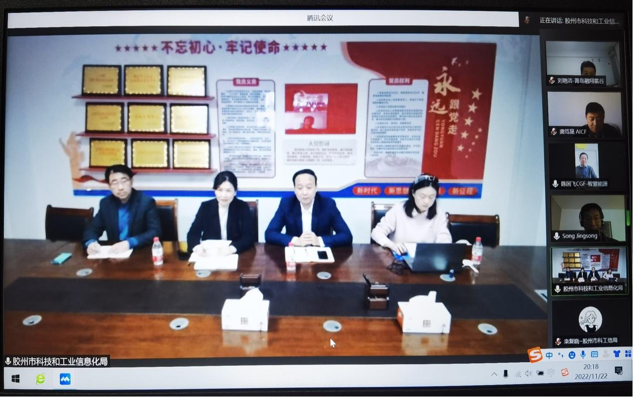 2022年11月22日 公司董事長陳國飛受膠州市委組織部劉孺霖部長、市科創中心副主任張磊委托與“中國旅法工程師協會”會長龔篤晟、常務理事宋勁松視頻連線交流,幫助膠州市政府進行外國高端人才引進、產業導入。