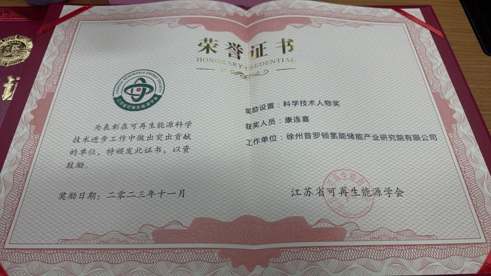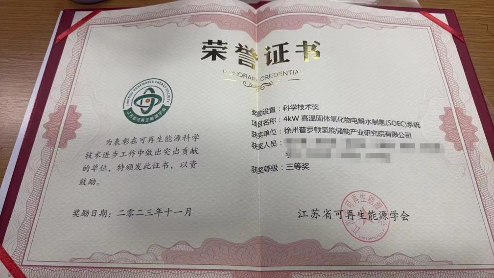 在江蘇省可再生能源學(xué)會(huì)科學(xué)技術(shù)獎(jiǎng)?lì)C獎(jiǎng)典禮中,質(zhì)子動(dòng)力徐州公司“4KW高溫固體氧化物電解水制氫(SOEC)系統(tǒng)”獲得科學(xué)技術(shù)獎(jiǎng),公司技術(shù)部負(fù)責(zé)人康連喜獲得科學(xué)技術(shù)人物獎(jiǎng)。質(zhì)子動(dòng)力徐州公司做為科學(xué)技術(shù)獎(jiǎng)獲獎(jiǎng)單位,受邀在現(xiàn)場(chǎng)做了關(guān)于《SOEC研發(fā)產(chǎn)業(yè)化進(jìn)展及ReSOC發(fā)展趨勢(shì)》的報(bào)告。